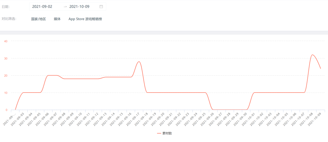 该游戏于9月30日上线海外市场,近一个月内每日投放素材数在10组到30组之间,尚未进行大规模的宣传推广,或许尚在调优阶段。
