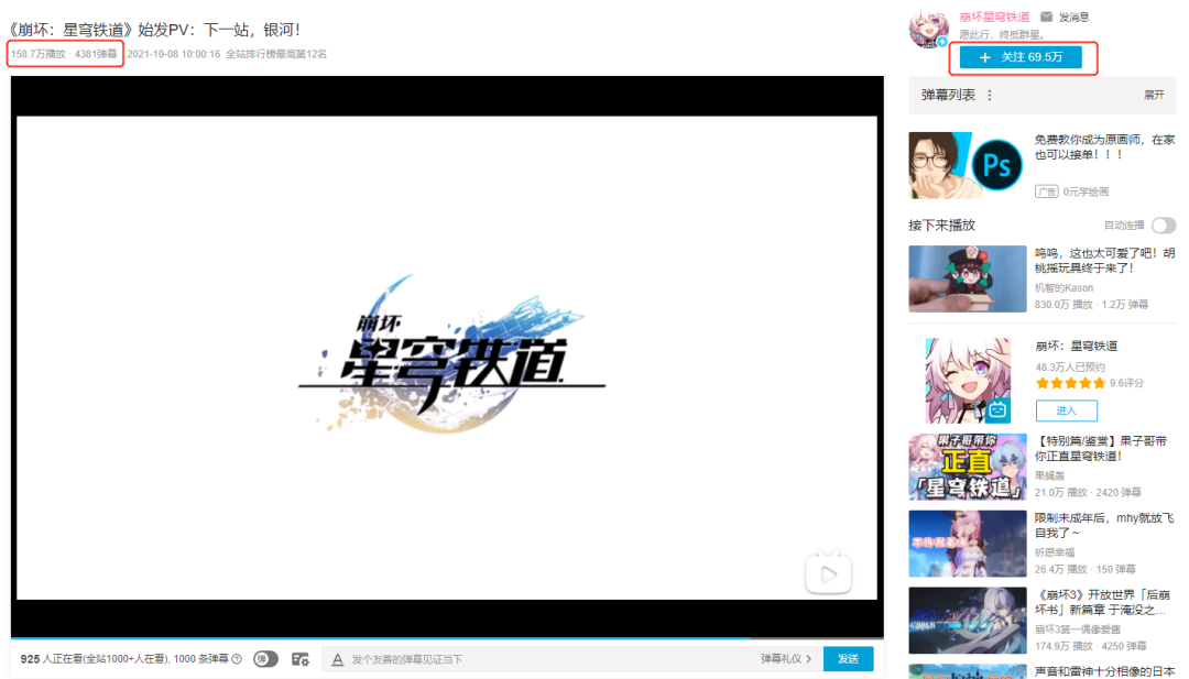 同样就在昨日,米哈游公布了新产品《崩坏:星穹铁道》始发测试的招募消息,目前游戏的首支宣传PV在B站的播放量已达158万次,B站官方账号粉丝数近70万。