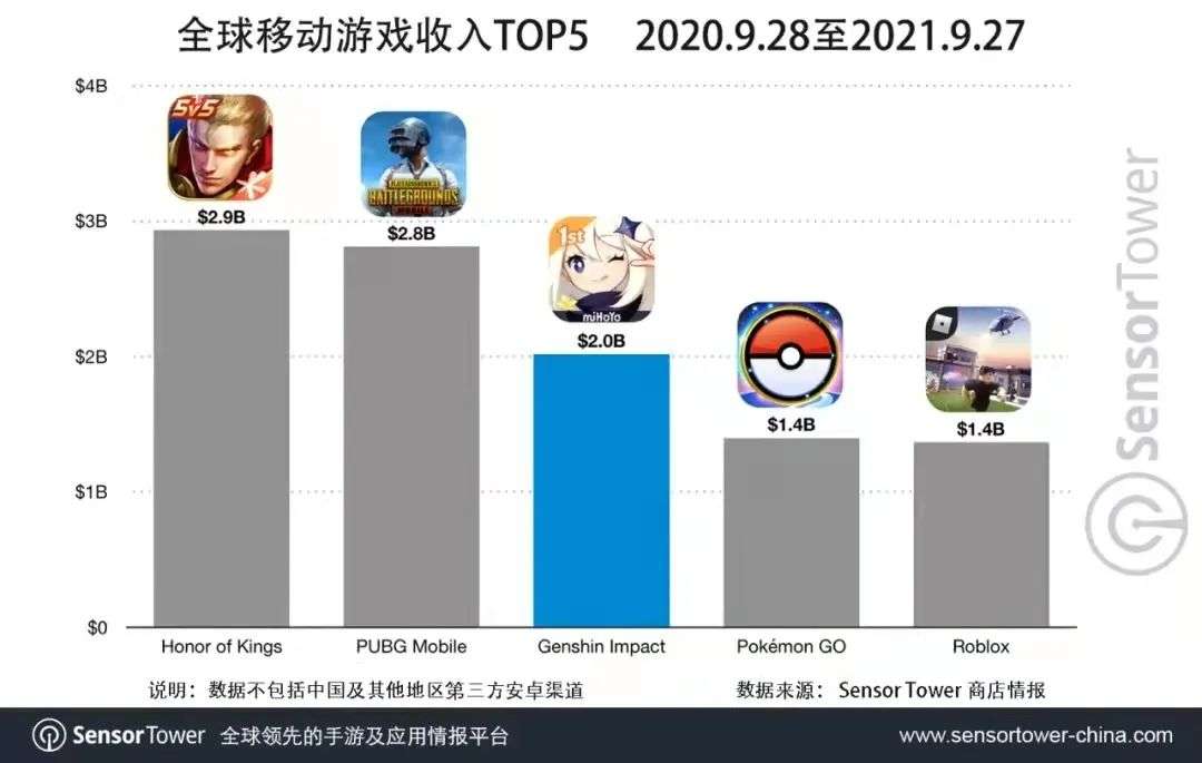 放眼全球市场,过去一年内《原神》名列全球手游畅销榜第3名,仅次于腾讯《王者荣耀》和《PUBG Mobile》(合并《和平精英》收入),超越了Niantic《Pokémon GO》和Roblox公司同名沙盒游戏平台《Roblox》。