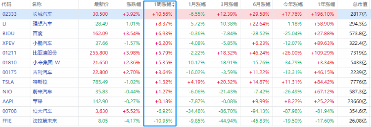 截至发稿的近一周来,新能源车相关公司股价大部分呈上涨状态。其中长城汽车近一周上涨幅度超过10%排名榜首,理想汽车和百度上周表现亦强劲,分列二三位;法拉第未来遭做空机构质疑,上周下跌近11%排名垫底,恒大汽车近一周亦出现下跌。