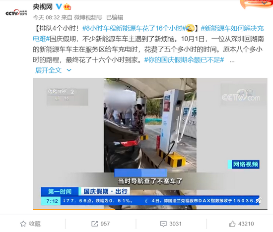 国庆假期,一位电动车主自驾从深圳返回湖南,在耒阳服务区给车充电时总共耗费了5个多小时,其中排队就花了4个小时。原本8个多小时的路程,最终花了16个小时。这一事件一时成为网上讨论的焦点,新能源车里程焦虑再度爆发。