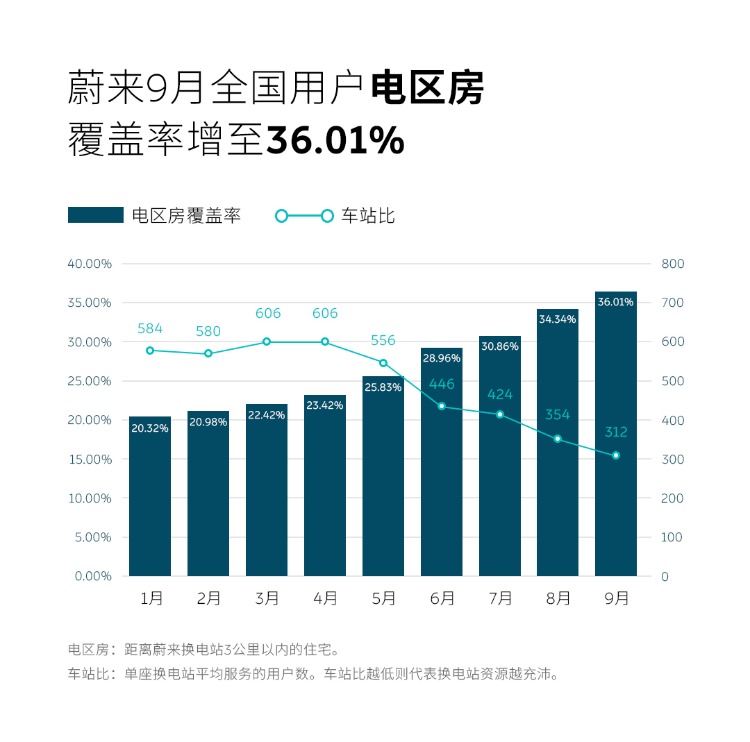 日前,蔚来官方公布了其在9月的换电站布局相关数据。据悉,蔚来9月全国新增90座换电站投入运营,“电区房”(蔚来定义换电站3公里以内的住宅)覆盖率达36.01%,同比提升122.56%。