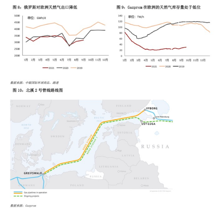 北溪2号管道值得一提,如果投入使用,俄罗斯每年可向欧洲提供550亿立方米的天然气。但事实进度并不会那么快。在欧洲天然气库存降至低位时,俄罗斯被质疑刻意限制出口,以证明北溪2号管线的作用。