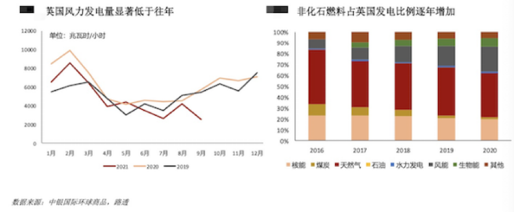 同时,新能源发电不足无疑加大了传统能源的需求。英国风力发电占2020年全英供电比例高达23%。但风力发电供应不稳定,受天气情况影响,风力发电量减少,一部分电力需求缺口需要由天然气来补充。英国风力发电量9月均值为2500兆瓦时,远低于去年同期水平(5700兆瓦时)。