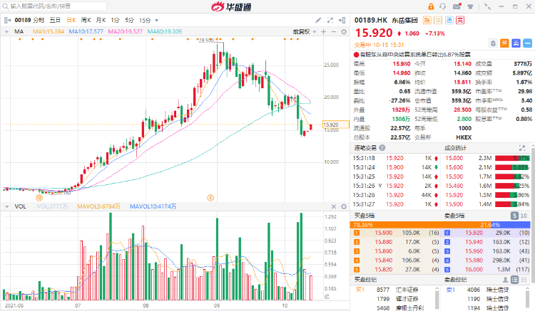 华盛资讯10月15日消息,今日东岳集团反弹走高。截至发稿,涨7.13%,报15.92港元每股,成交额5.89亿港元,最新市值359.3亿港元。