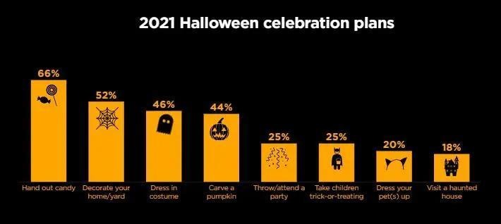 据全美零售联合会(NRF)预测,今年美国消费者在万圣节相关商品上的支出预计将达到101.4 亿美元,高于2020年的80.5亿美元,预计将创下历史新高。