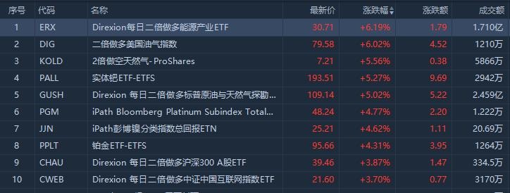 从ETF涨幅榜来看,每日二倍做多能源产业ETF $ERX 涨6.19%,成交额1.71亿美元;二倍做多标普原油与天然气ETF $GUSH 涨5.02%,成交额2.456亿美元。