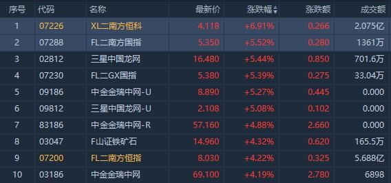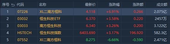 南方两倍做多恒科 $07226.HK 涨6.91%,成交额为2.075亿港元;