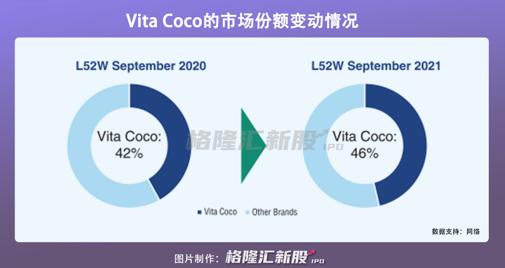 而从2020年9月至2021年9月,Vita Coco在美国椰子水品类的市场份额从42%增至46%,排在第一。