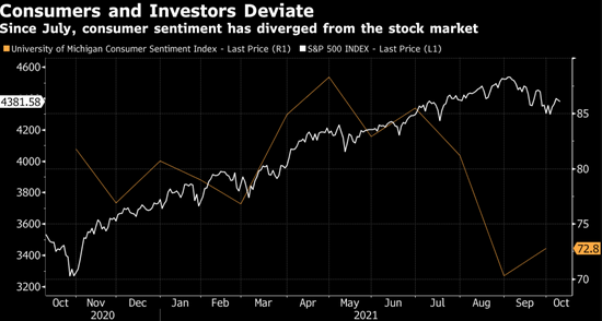 通常情况下,消费者信心与股市走势同步,因为消费占美国GDP的三分之二。但是,虽然多项消费者信心指标自7月份见顶以来已经大幅下滑,但标普500指数却继续上涨,目前仅比历史高点低4%。