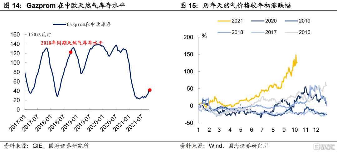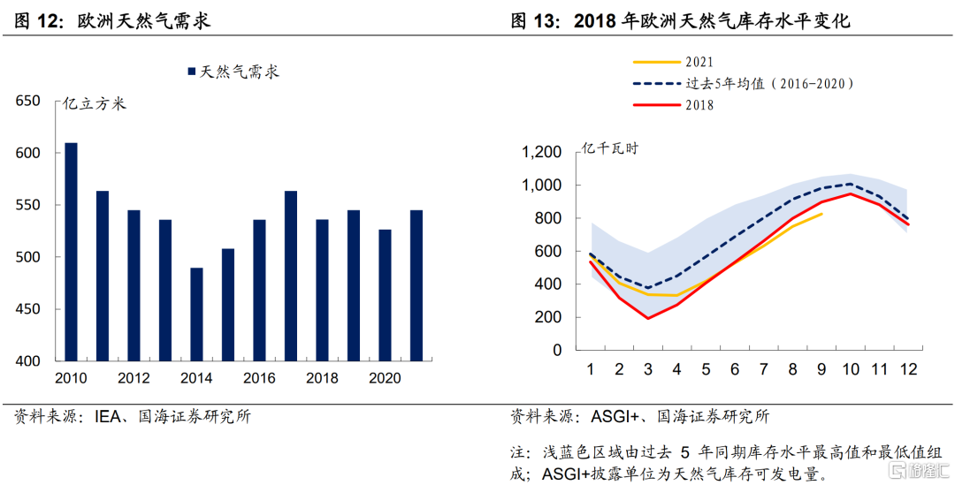 从库存水平和天然气需求量上来看,当下天然气供需格局与2018年更为类似。天然气需求上,根据IEA预测,2021年欧洲天然气需求量在545亿立方米左右,与2018年的536亿立方米左右水平相当;库存水平上,当下欧洲天然气库存水平远低于过去5年最低值,而2018年全年欧洲天然气库存水平也处于过去5年的较低位置。