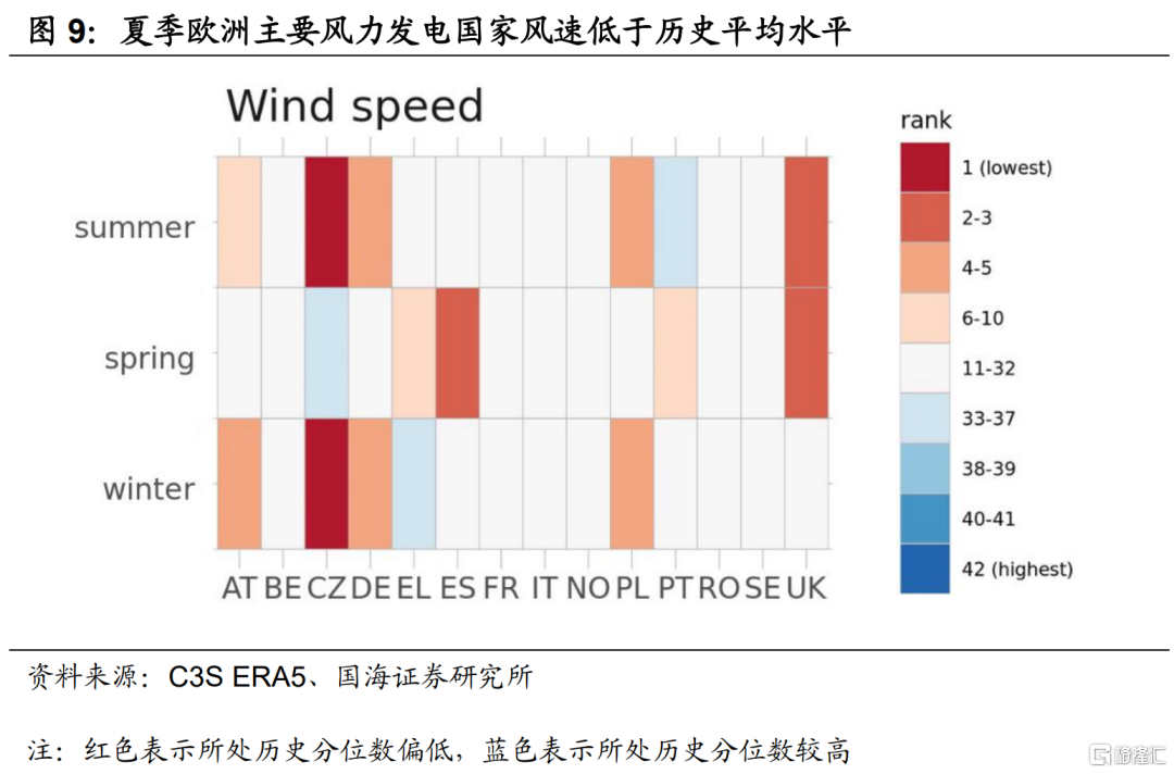 (2)夏季欧洲缺风,美洲少水,天然气补库压力剧增。正如上文所提及,新能源顶替了部分传统石化能源发电的职能,其中欧洲的风力发电占据了新能源发电的“半壁江山”,然而今年夏季欧洲风速低迷,风力发电表现疲软,从而对天然气发电产生了一定压力,使得整个欧洲在夏季的天然气类库进程大幅减缓,是目前欧洲天然气库存远低于历史同期水平的主要原因。