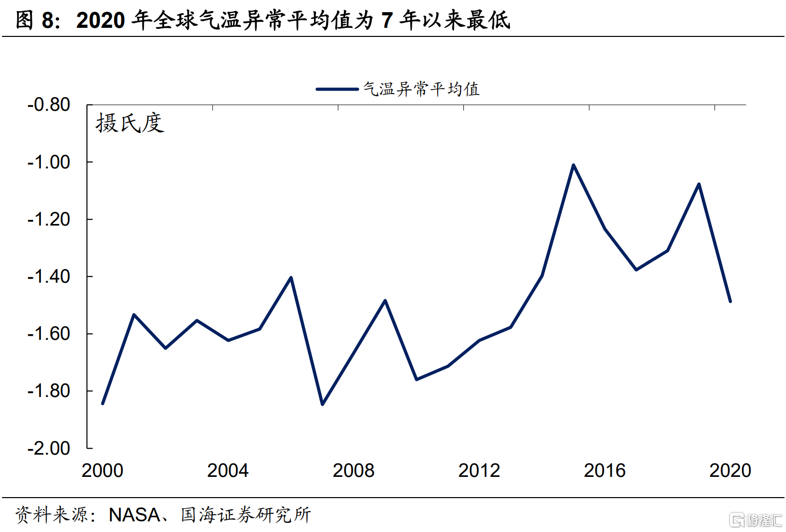 (1)2020年冬天较以往更长更冷,年初天然气去库进程更为持久。我们将2000年以来每年的12月份以及次年的1月份、2月份定义为当年北半球的冬季,通过计算NASA统计的全球平均地表气温相对历史均值的偏离度来看,2020年的冬天平均气温偏离度为2013年以来的最大值,换言之,2020年北半球经历了一个更为寒冷的冬天。
