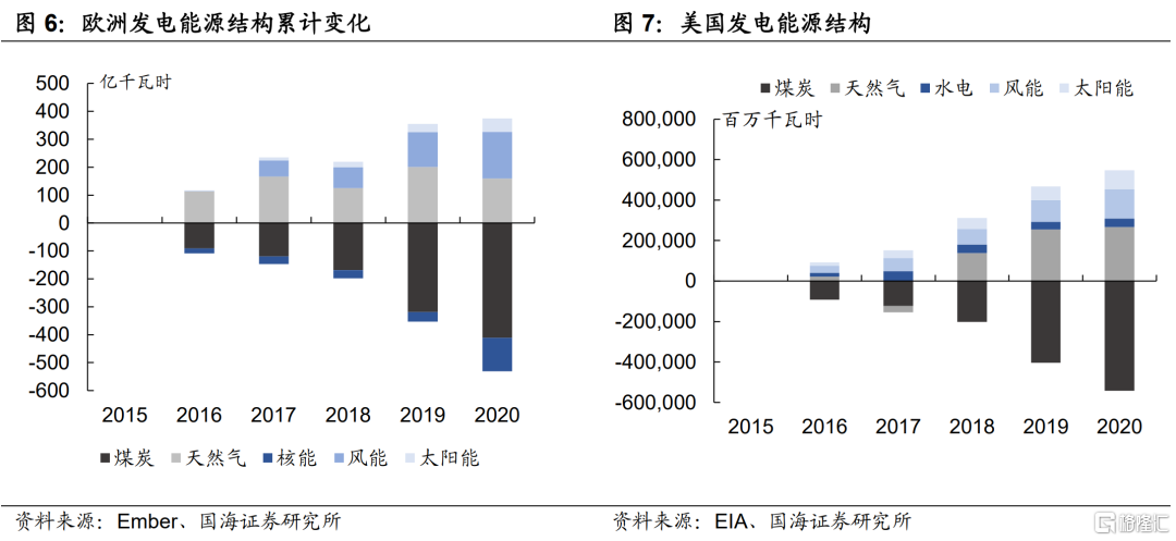纵观过去10年欧美绿色能源的升级进程,石化能源发电量减少的一半几乎均由可再生能源接棒,而另一半则依靠天然气补位。其中,美国对天然气发电更加依赖,截至2020年,全美40%的电力生产依靠天然气发电支持。在天然气发电在各国占比越来越大的环境下,天然气在各国能源结构中的重要性越发凸显,天然气库存水平对天然气价格的扰动也越发显著。