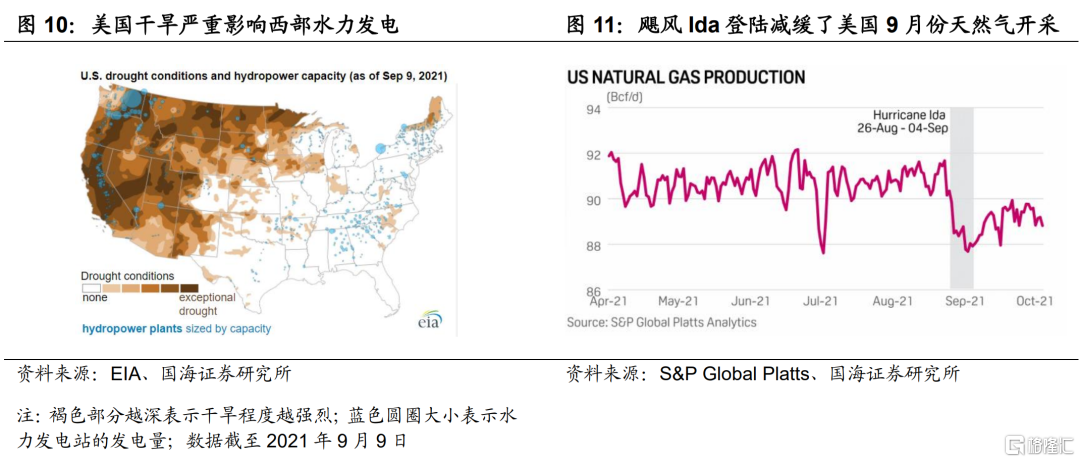 类似的情况同样也发生在美洲大陆上,然而不同的是,美国中部今年的风力发电尚可,而水力发电因受持续干旱天气影响,得到一定程度的制约,需要天然气发电来补位。除此之外,9月份Ida飓风的登陆使得南部海湾的一些石油、天然气开采停滞,也在供给端上,一定程度减缓了天然气补库进程,从而导致了美国天然气库存目前低于历史同期水平。