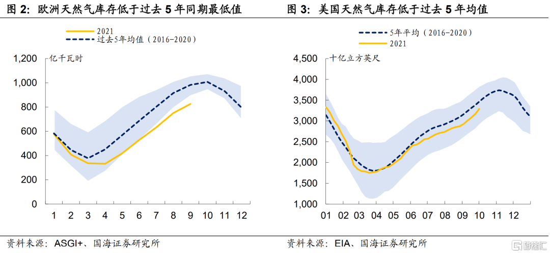 今年极端气候的频发是天然气困局的主要导火索。一般而言,天然气需求具有季节性,冬季由于北半球需要用电取暖,往往对天然气发电需求较大,是天然气的去库期;而年中则是天然气补库的重要时间。今年极端天气对天然气库存的影响主要体现在两个方面: