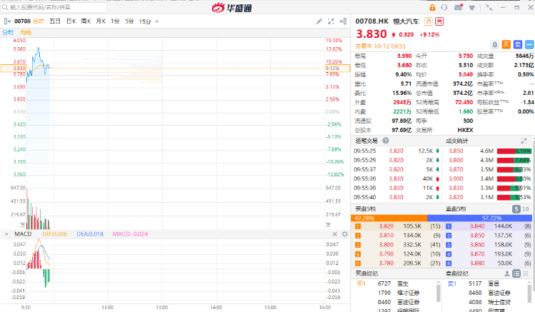 华盛资讯10月12日消息,恒大汽车昨日召开合作伙伴大会,誓确保恒驰首车明年初下线。今日恒大汽车盘中涨9.12%,股价报3.83港元,成交额2.17亿港元。
