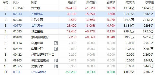 盘面上,汽车股短线拉升,截至发稿,长城汽车涨5.25%,现报32.1港元每股,成交额3.71亿港元;广汽集团涨3.69%;吉利汽车涨3.08%;比亚迪股份微跌。