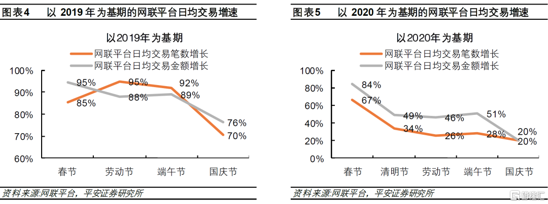 根据网联平台的统计,今年国庆节假期,网联平台共处理资金类跨机构网络支付交易140.69亿笔、金额7.60万亿。与去年国庆节假期相比,日均笔数和日均金额分别同比增长20.06%和20.02%,明显低于两者今年春节、清明节、劳动节和端午节的增速(网联平台未公布中秋节的交易数据)。为剔除基数效应的影响,以2019年为基期,今年国庆节期间的日均交易笔数和交易金额,分别增长了70.5%和76.4%,同样低于今年春节、劳动节、端午节期间的增速。可见,尽管今年国庆期间网联平台支付日均交易笔数和交易金额的同比增速都超过20%,但无论是以2019年还是2020年为基期,增速都较今年前几个节日的增速明显回落,也和国内旅游增速的趋势相一致。