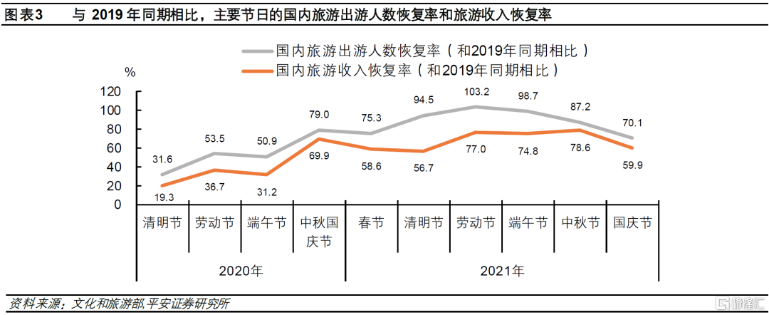 根据文化和旅游部数据中心的测算,10月1日至7日,全国国内旅游出游5.15亿人次,按可比口径同比减少1.5%,按可比口径恢复至疫情前同期的70.1%;实现国内旅游收入3890.61亿元,同比减少4.7%,恢复至疫情前同期的59.9%。与2019年同期相比,主要节日的国内旅游出游人数恢复率于今年五一劳动节见顶,国内旅游收入恢复率于今年中秋节见顶。今年国庆节两者的恢复率,与中秋节的恢复率相比都下降了近两成。