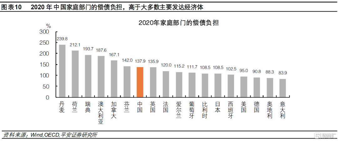 二是偿债负担,即居民债务/可支配收入。2020年中国家庭部门的偿债负担为137.9%,对比OECD所公布的部分国家的数据,发现中国家庭部门的偿债负担,同样高于英国、法国、日本、美国、德国和意大利等主要发达经济体。