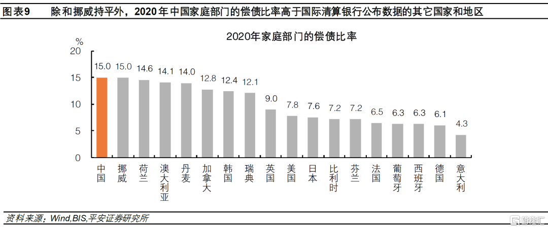 可从两个指标看中国家庭部门的偿债压力。一是偿债比率,即家庭部门的应还债务本息/可支配收入。国际清算银行公布了部分国家的居民部门偿债比率。为保证数据的横向可比性,债务期限部分我们采用和国际清算银行一样的假设,即债务剩余期限为18年。由于中国家庭部门的债务主要是房贷,债务利率采用个人住房贷款加权平均利率,2020年四季度为5.34%。可计算得2020年中国家庭部门的偿债比率为15.0%,在国际清算银行公布数据的所有17个国家中,和挪威持平,高于其它16个国家。