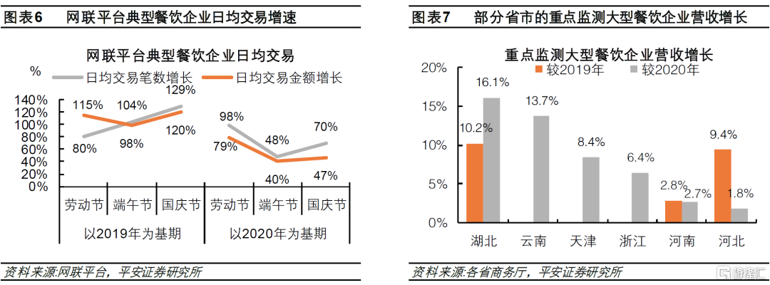 今年国庆期间餐饮业继续恢复。网联平台数据显示,今年典型餐饮企业国庆长假期间日均交易笔数和日均交易金额,分别同比增长70%和47%,虽都低于劳动节期间的增速,但表现要好于端午节。如果以2019年为基期,今年国庆典型餐饮企业通过网联平台的日均交易笔数和交易金额,分别增长了129%和120%,都高于今年劳动节和端午节的增速。部分省市公布了国庆期间重点监测的大型餐饮企业营收数据,比如湖北和云南的同比增速都超过10%;如果以2019年为基期,湖北、河北的大型重点监测餐饮企业营收增长都超过9%。
