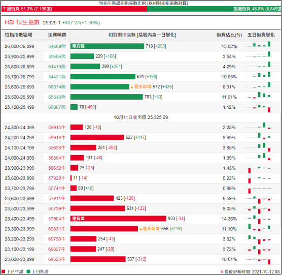 街货分布方面,至周一,恒指牛证街货重货区仍在收回价23300点至23700点之间,累计相当约2,543张期指合约;恒指熊证街货重货区在收回价25500点至25900点之间,累计相当约2,196张期指合约。