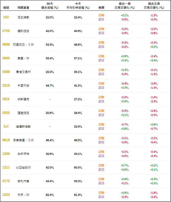 周一恒指相关权证的平均引伸波幅约22.4%,按日持平。个股方面,阿里、快手等相关认沽证的引申波幅均按日调降显著;相反,美团、平安、纳斯达克、汇丰、道琼斯、比迪等相关认沽证的引申波幅则按日有所调升。