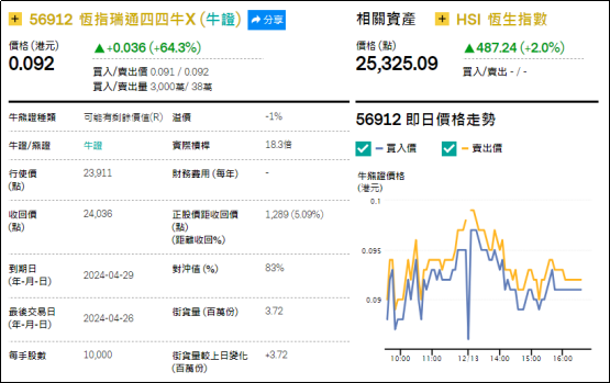 1、强势轮证:恒指瑞通四四牛(56912.HK),周一上涨64.3%;