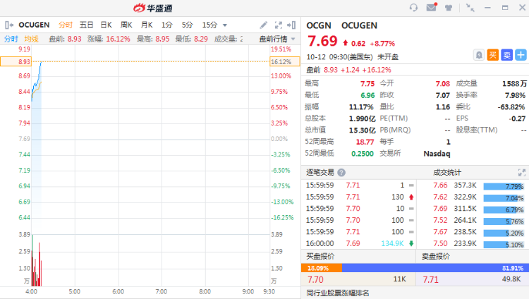 华盛资讯10月12日消息,Ocugen(OCGN)盘前续涨8%,该股周一收涨8.77%。