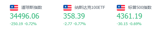 道指跌250.19点,或0.72%,报34496.06点;纳指跌93.34点,或0.64%,报14486.20点;标普500指数跌30.15点,或0.69%,报4361.19点。