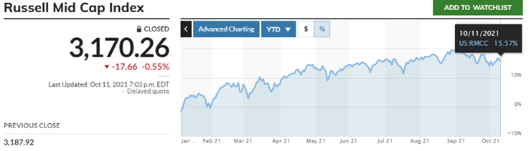FactSet的数据显示,罗素中盘股指数在2021年上涨了约16%,优于追踪小盘股的罗素2000指数约13%的涨幅。只是,这个涨幅略差于科技股权重较大的标普500指数今年近17%的涨幅。今年Guggenheim标普500等权重ETF $RSP 则是上涨了近20%。