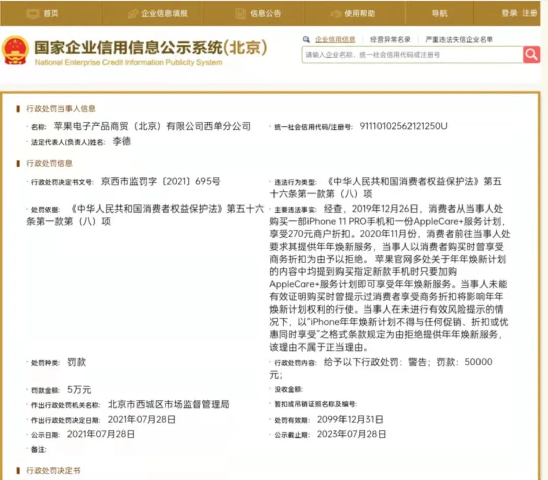 10月12日,中证君从国家企业信用信息公示系统网站获悉,京西市监罚字〔2021〕695号行政处罚决定书显示,经查,2019年12月26日,消费者从当事人处(苹果北京西单公司)购买一部iPhone 11 PRO手机和一份AppleCare+服务计划,享受270元商户折扣。2020年11月份,消费者前往当事人处要求其提供“年年焕新”服务,当事人以消费者购买时曾享受商务折扣为由予以拒绝。