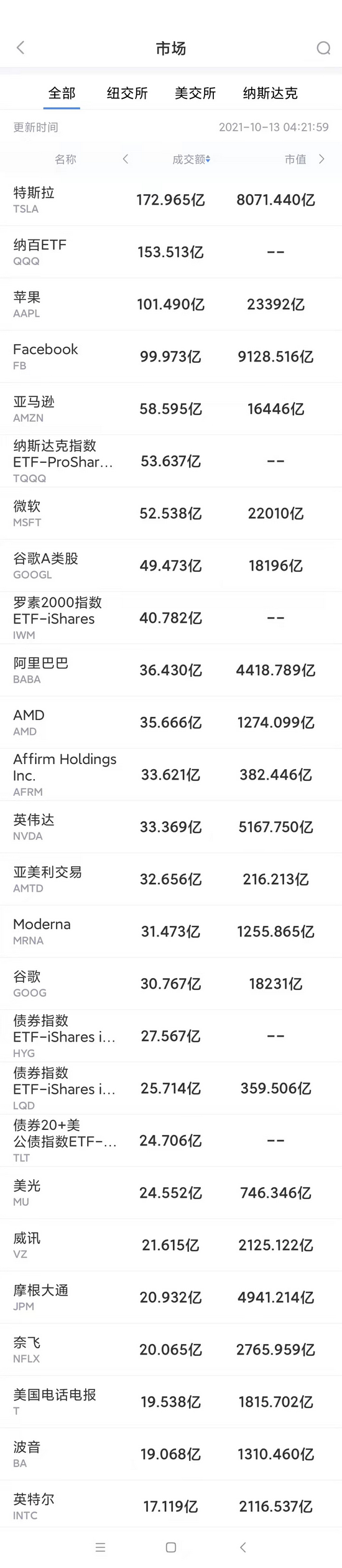 以下为美股当日交易最活跃的20只股票(按成交额):