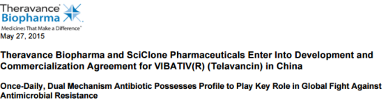 2015年5月,赛生药业与Theravance达成协议,获得在中国大陆和香港特别行政区、澳门特别行政区、台湾地区和越南独家开发和商业化Vibativ权利。