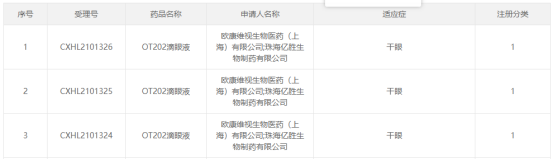 10月12日,CDE官网显示,欧康维视OT202滴眼液临床试验申请首次获得药监局的批准,用于治疗干眼症。