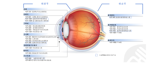 目前,欧康维视在研的干眼症药物有4款,分别是OT-202、OT-204、OT-503、OT-1301。其中OT-204是由汇恩兰德研发的一款玻璃酸钠滴眼液,欧康维视拥有中国内地权益,已完成商业化;OT-503是由Nicox研发的一款丙酸氟替卡松纳米晶体,欧康维视拥有大中华区权益,已在美国完成II期临床试验,国内尚处于临床前阶段。而OT-1301是欧康维视自主研发的一款环孢素植入剂,尚处于临床前阶段。