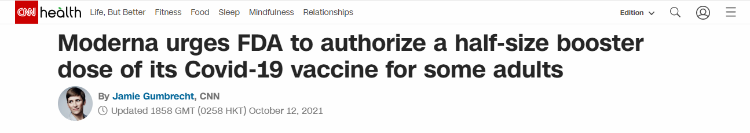 根据周二(10月12日)发布的一份简报文件,Moderna 正在敦促美国食品和药物管理局批准其 Covid-19 疫苗的半剂量加强针,该机构的疫苗顾问将召开重要会议。