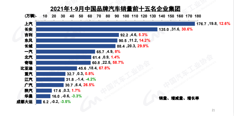 整个三季度一直笼罩在“缺芯”的阴影之中。乘用车因芯片不足,导致9月产销分别完成176.7万辆和175.1万辆,环比分别增长18.1%和12.8%,同比分别下降13.9%和16.5%,降幅比8月分别扩大2和4.8个百分点。