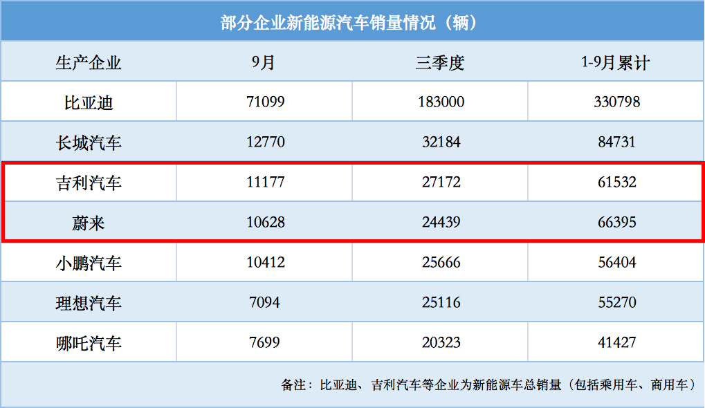 需要注意的是,在“蔚小理哪”紧张的排位赛中,新造车企业的销量直逼传统汽车巨头。1-9月,蔚来汽车总销量已经超过吉利新能源汽车近5000辆,而这是在前者只有三款车型实现量产交付情况下实现的。