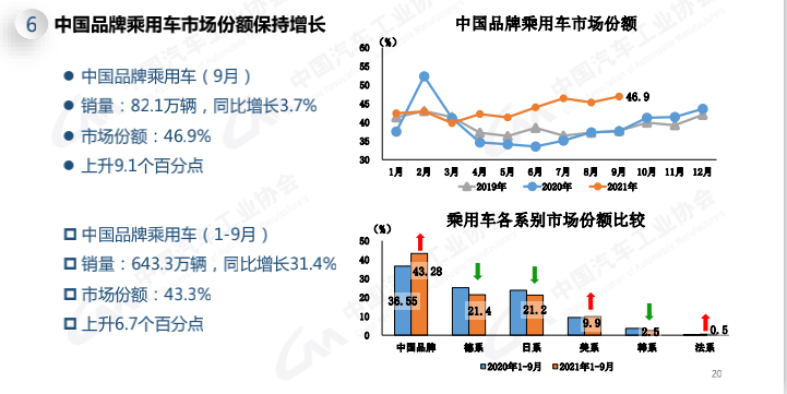 今年9月,中国品牌乘用车销量为82.1万辆,同比增长3.7%。市场份额达到46.9%,上升9.1个百分点,对乘用车市场整体的拉动作用明显。从前9月表现来看,中国品牌乘用车总销量已达到了643.3万辆,同比增长31.4%,市场份额为43.3%,上升6.7个百分点。相比之下,德系、日系、韩系等品牌在中国市场均出现下降,只有基数相对较小的美系和法系出现上升。