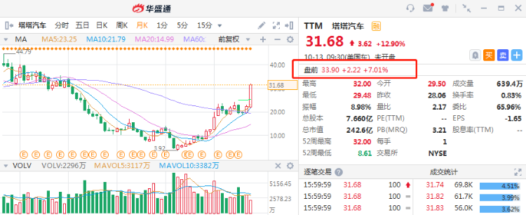 华盛资讯10月13日消息,美股盘前,塔塔汽车(TTM)股价继续冲高,再涨超7%,该股昨日收涨近13%,此前与TPG基金达成电动车业务交易。