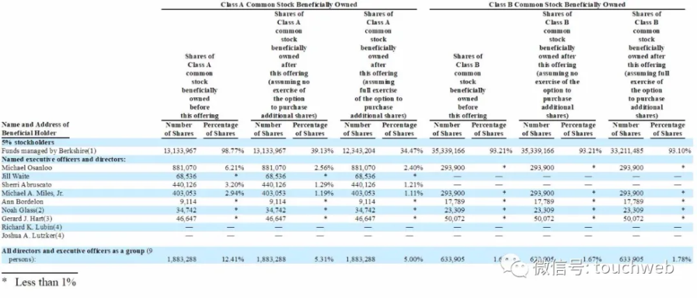 IPO前,Funds managed by Berkshire持股为98.77%的A类股,及93.21%的B类股;IPO后,Funds managed by Berkshire持有34.47%的A类股,及93.10%的B类股。
