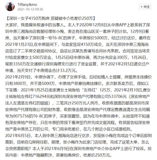 她已于2021年6月9日在深圳市房地产中介协会App上进行了投诉,投诉内容:中原地产隐瞒欺诈,恶意抬高房价,吃差价250万元。