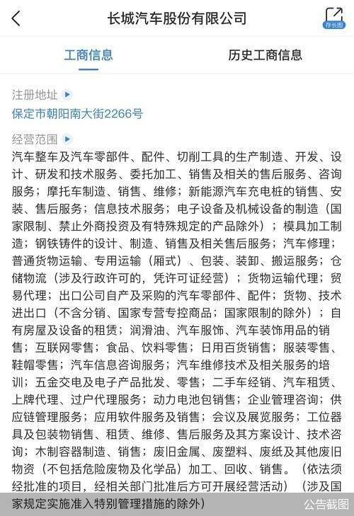 天眼查显示,长城汽车工商信息发生变更,在经营范围内新增摩托车制造、销售及维修。同时,注册资本也由91.77亿元增至92.36亿元,增幅约0.65%。