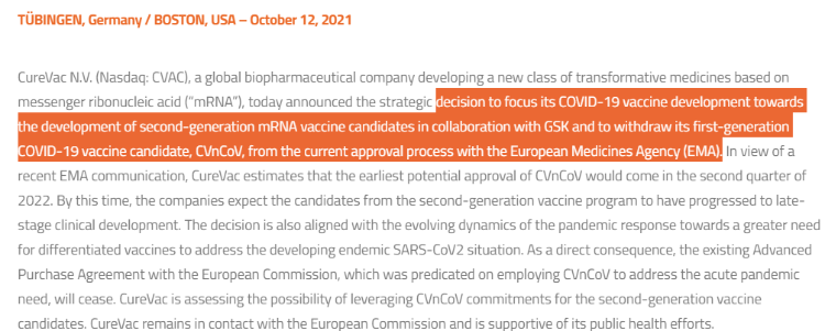 10 月 12 日,CureVac宣布从 EMA 批准程序中撤出其第一代COVID-19候选疫苗CVnCoV,这一决定也意味着该公司与欧盟委员会此前达成的4.05亿剂疫苗预采购协议将终止。