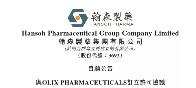 翰森制药集团有限公司宣布,于2021年10月11日,翰森(上海)健康科技有限公司及江苏豪森药业集团有限公司,已与OliX Pharmaceuticals, Inc. (KOSDAQ: 226950)(「OliXPharamceuticals」)订立独家许可合作协议(「许可协议」)。