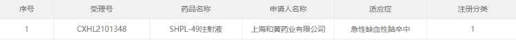 10月13日,根据CDE官网,和黄医药1类新药SHPL-49注射液获批临床(受理号:CXHL2101348),拟用于治疗急性缺血性脑卒中。