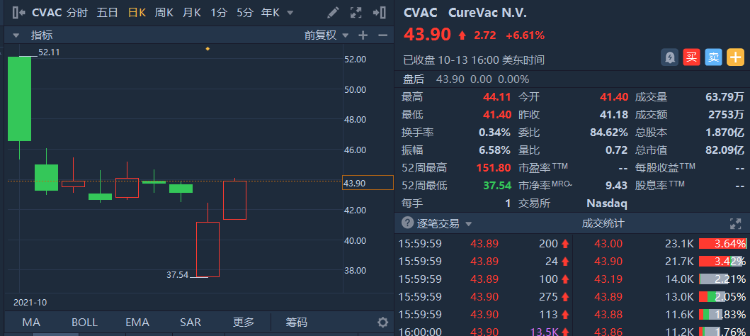昨日,CureVac收涨6.61%,报43.90美元,总市值为82.09亿美元。